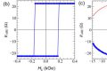 図(a)2重CoFeB構造 (b)垂直磁界および(c)面内磁界を印加した時の異常ホール抵抗(~磁化垂直成分)曲線。