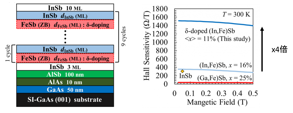 ホール効果センサーはエアコンや洗濯機などでセンサーとして多用されています。また、最近に3軸のホール効果センサーがスマートフォンなどに掲載されて、GPSと組み合わせて地図アプリで使われています。今回の研究では、室温強磁性半導体(In,Fe)Sbの「異常ホール効果」を利用した新しいタイプの超高感度異常ホール効果磁気センサーを提案し、その高感度化と高線形化を目指して、Fe元素を局所的に添加するδドーピング法を用いました。その結果、4倍程度の高感度化と高線形化に成功しました。
