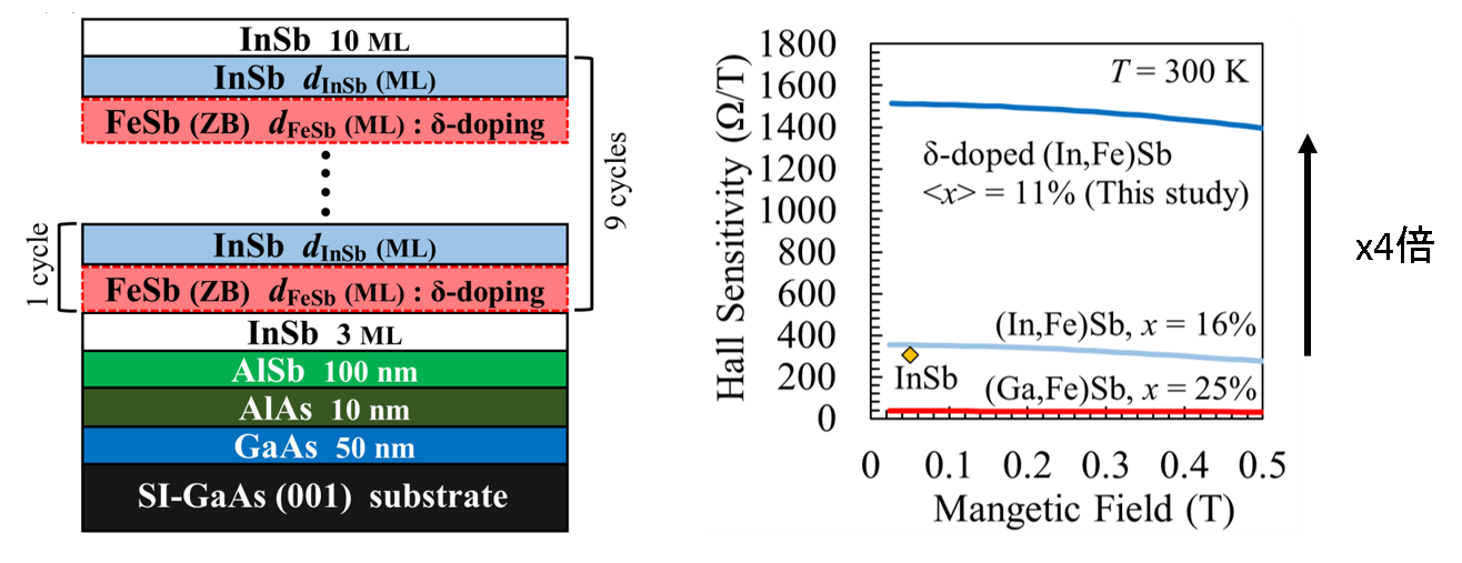 ホール効果センサーはエアコンや洗濯機などでセンサーとして多用されています。また、最近に3軸のホール効果センサーがスマートフォンなどに掲載されて、GPSと組み合わせて地図アプリで使われています。今回の研究では、室温強磁性半導体(In,Fe)Sbの「異常ホール効果」を利用した新しいタイプの超高感度異常ホール効果磁気センサーを提案し、その高感度化と高線形化を目指して、Fe元素を局所的に添加するδドーピング法を用いました。その結果、4倍程度の高感度化と高線形化に成功しました。
