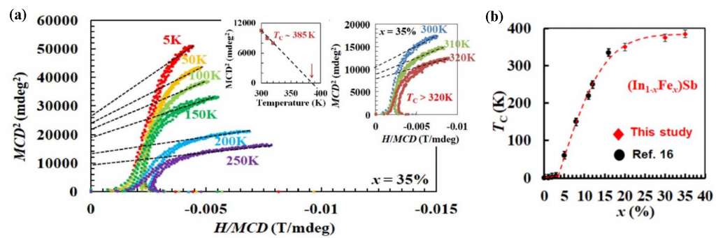 (a)Fe 35%添加したInSb半導体におけるキュリー温度の同定(アロットプロット)。キュリー温度が385 Kに達したことが分かる。(b)キュリー温度温度のFe濃度依存性。