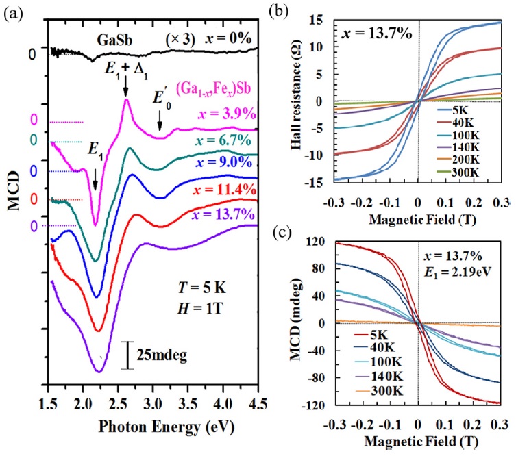 GaFeSb(a) 様々なFe濃度における(Ga,Fe)Sbの磁気円二色性(MCD)スペクトル。Fe濃度の増大につれて、GaSbの光学特異点におけるMCDが強くなり、(Ga,Fe)Sbのバンド構造がスピン分裂していることが分かる。(b) Fe濃度13.7%サンプルの異常ホール効果および(c)MCD強度の磁場依存性。強磁性によるヒステレシスが発現していることが分かる。このサンプルのキュリー温度が140 Kに達して、(In,Mn)Asや(Ga,Mn)Sbの最高キュリー温度よりもずっと高い。