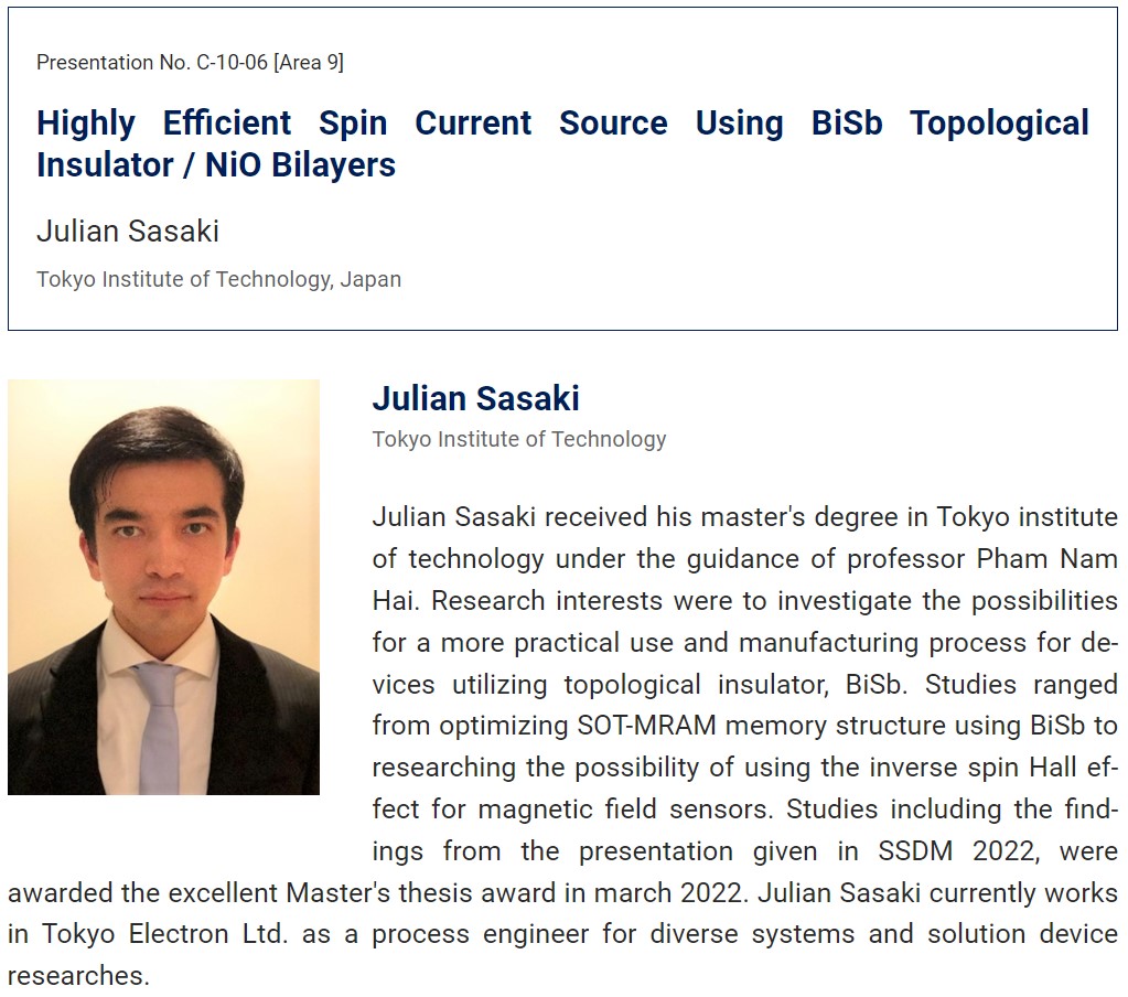 OBの佐々木 樹里行氏が2022年のSSDM国際学会で発表した研究発表について、SSDM Young Researcher Awardを受賞しました。2023年のSSDM国際学会で受賞式が行われます。おめでとうございます!なお、佐々木 樹里行氏は修士優秀論文賞および修士課程修了者の代表にも選べられました。