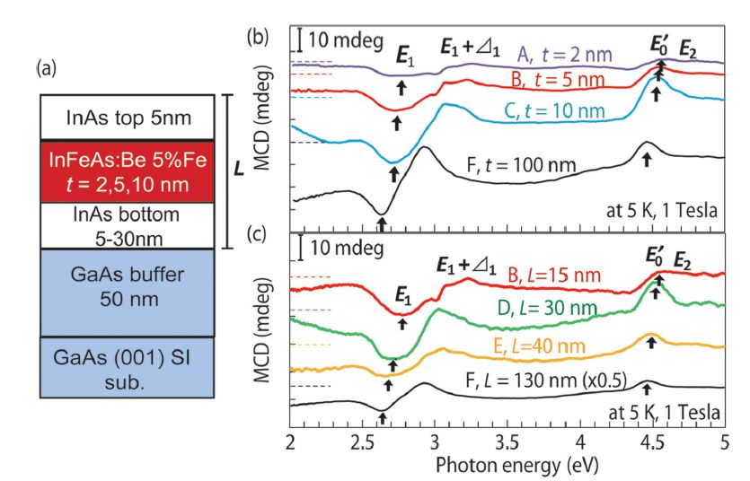 (a) (In,Fe)As強磁性半導体を含む量子井戸の構造。(b) 量子井戸の磁気色二性(MCD)のスペクトル。量子井戸の幅が小さくなるにつれて、光学遷移の特異点エネルギーが系統的にブルーシフトしたことが分かる。
