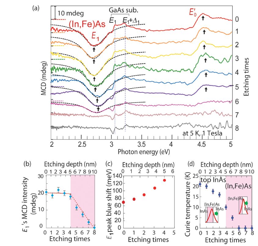 精密エッチングによって量子井戸を削った時の(a)磁気円二色性(MCD)のスペクトル、(b) E1ピークの強度の変化、 (c)E1ピーク位置のバルク値からの変化量、(d) キュリー温度の変化。注目すべき点は表面のInAs層を削っただけでも、真ん中の強磁性(In,Fe)As層のキュリー温度も変化する。これは量子井戸内の電子波動関数が基板側に移動したため、波動関数とFeスピンとの重なりが減少したためである。