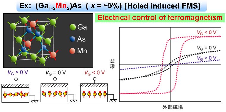 磁性材料と半導体材料の特長を融合できる新材料として強磁性半導体(Ferromagnetic Semiconductor; FMS)は特に重要な材料系であり、大変注目されている。強磁性半導体は非磁性半導体の一部の原子が磁性原子で置換された半導体であり、既存の半導体結晶成長技術とデバイスプロセス技術と極めて高い親和性を持つ上、電界効果や光照射による磁気特性の変調など、従来の半導体や強磁性金属では得られない機能を有する材料でもある。さらに、強磁性半導体は単結晶かつエピタキシャル成長可能であるため、膜厚を原子レベルで制御することが可能である。従って、強磁性半導体材料を用いれば、半導体ベースの超高速不揮発性メモリや再構成可能な超高速論理回路など、従来の半導体デバイスに無い新しい機能性半導体デバイスの創製が期待できる。